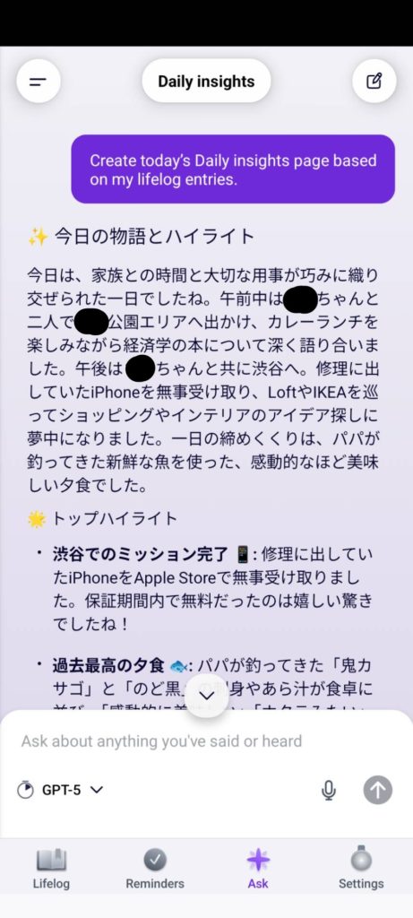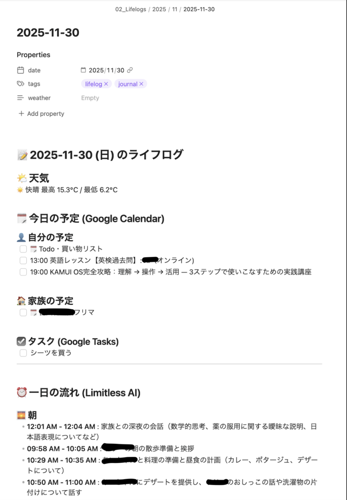 - 1日の流れとインサイト、家族個人のハイライトを Obsidianのライフログに記録